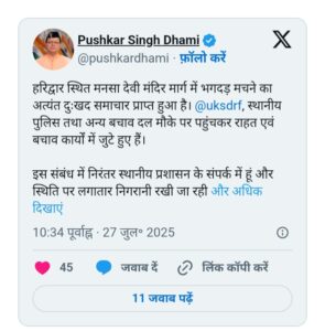 वहीं मुख्यमंत्री पुष्कर सिंह धामी ने घटना पर दुख जताया है. सीएम धामी ने अपने सोशल मीडिया हैंडल एक्स पर लिखा कि हरिद्वार मनसा देवी मंदिर मार्ग पर भगदड़ होने का दुःखद समाचार प्राप्त हुआ है. स्थानीय पुलिस तथा अन्य बचाव दल मौके पर पहुंचकर राहत एवं बचाव कार्यों में जुटे हुए हैं. इस संबंध में निरंतर स्थानीय प्रशासन के संपर्क में हूं और स्थिति पर लगातार निगरानी रखी जा रही.